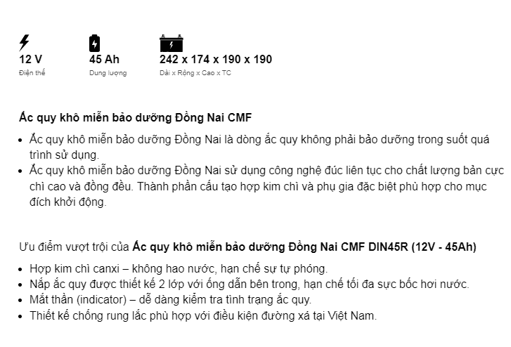 Dòng CMF là ắc quy miễn bảo dưỡng (ắc quy khô, kín) của Đồng Nai đảm bảo về chất lượng cũng như giá thành sản phẩm. Ắc quy làm từ hợp kim chì canxi có bổ sung thiếc, bạc nhập khẩu từ Úc nên không hao nước, hạn chế sự tự phóng điện. Nắp bình được thiết kế 2 lớp với ống dẫn bên trong, giúp giảm tối đa sự bốc hơi nước. Trong bình trang bị bộ phận lọc chống bắt lửa – an toàn khi sử dụng và Indicator (mắt thần) – dễ dàng kiểm tra tình trạng ắc quy.
