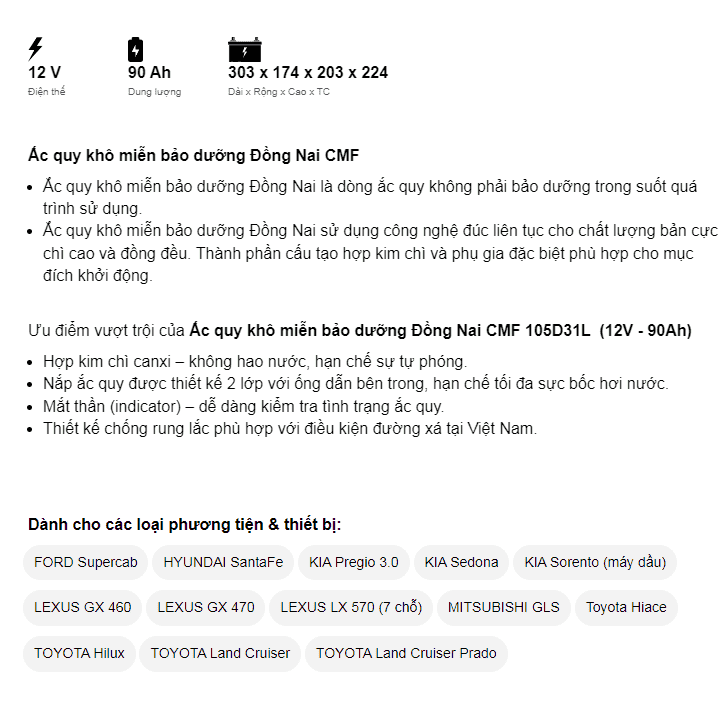 Dòng CMF là ắc quy miễn bảo dưỡng (ắc quy khô, kín) của Đồng Nai đảm bảo về chất lượng cũng như giá thành sản phẩm. Ắc quy làm từ hợp kim chì canxi có bổ sung thiếc, bạc nhập khẩu từ Úc nên không hao nước, hạn chế sự tự phóng điện. Nắp bình được thiết kế 2 lớp với ống dẫn bên trong, giúp giảm tối đa sự bốc hơi nước. Trong bình trang bị bộ phận lọc chống bắt lửa – an toàn khi sử dụng và Indicator (mắt thần) – dễ dàng kiểm tra tình trạng ắc quy.