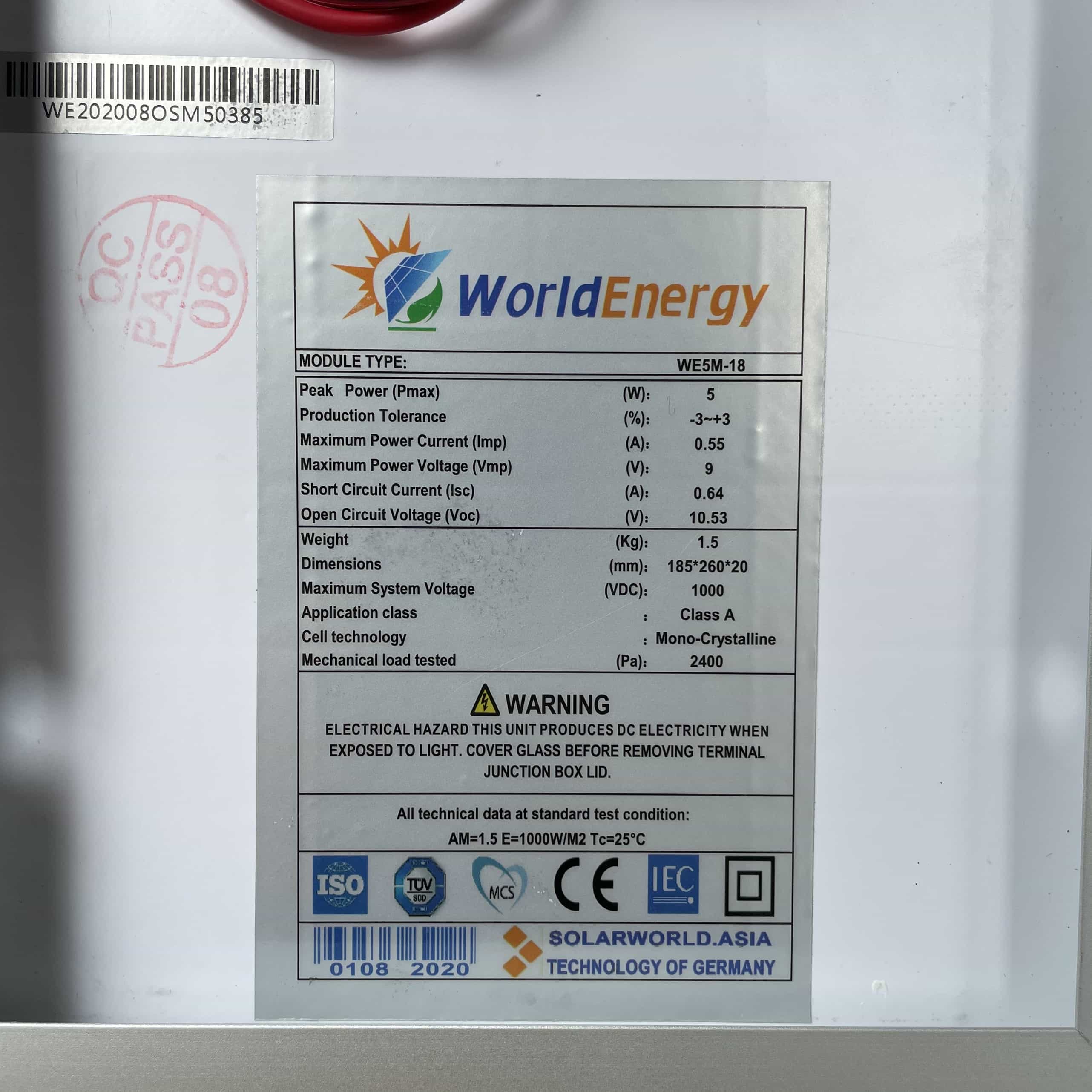 Tấm pin năng lượng mặt trời Mono 5W WorldEnergy (Solar panels) đáp ứng tiêu chuẩn chất lượng nghiêm ngặt của IEC, UL, CE, TUV , ETL, PV Cycle, MCS, BBA, Safety class II. Bảo hành hiệu suất 25 năm để đảm bảo hiệu suất tối đa cho hiệu quả hệ thống cao nhất.